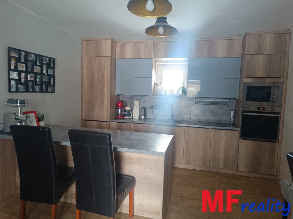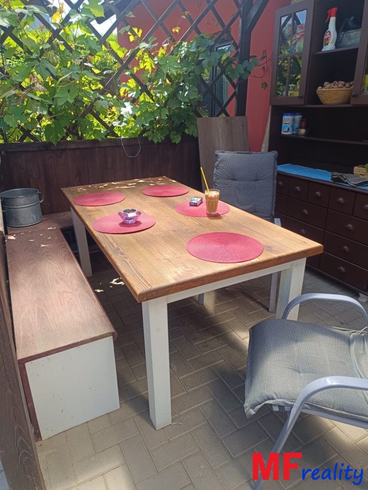 Nabízím k prodeji přízemní rodinný dům 3+1 o celkové užitné podlahové ploše 82,7 m2, s bazénem 3 x 5 x 1,5m a pergolou. Celková plocha pozemku je 680 m2, z toho zastavěná plocha a nádvoří 217 m2, zahrada má 463 m2. Jedná se o objekt k bydlení - rodinný dům, který pochází z roku 1956 a je s jedním nadzemním podlažím bez podsklepení s částečným podkrovím a s částečně nevyužitým půdním prostorem. V 80 letech byly provedeny stavební úpravy s přístavbami. Další stavební úpravy proběhly v posledních deseti letech (okna, podlahy, střešní krytina, vytápění, vybavení, instalace, úpravy povrchů i částečný interiér s kuchyní). Dům o dispozici 3+1 s příslušenstvím a skladem v zadním jihozápadním rohu původní stodoly. Vstup do domu je ze západní strany z předsíně, která složí i jako technická místnost. Chodbou navazuje koupelna vybavena vanou s toaletní skříňkou, toaletou. Dále následuje obývací pokoj, z kterého je umožněn vstup do ložnice a nové kuchyně vyrobené na míru s jídelním prostorem, odkud je vstup východním směrem na terasu s dřevěnou pergolou. Za kuchyní se nachází dětský pokoj, ze kterého vedou schody do části podkroví - šatny, sloužící pro spaní. Zbývající část pod střešním prostorem je půda, nyní nevyužívaná, s přístupem po žebříku ze skladu. Střecha hlavní budovy je sedlová s lomením v místě přístavby s plechovou krytinou Satjam, na které je nainstalováno 18 fotovoltaických panelů. Podlahy v obytných místnostech dřevěné, betonové s dlažbou v kombinaci vinylové a PVC. Vytápění je tepelným čerpadlem a náhradním zdrojem elektrokotlem umístěným v chodbě, radiátory závěsné, elektroinstalace světelná i motorová s měřením elektro umístěným ve zdi. Rozvody studené a teplé vody - ohřev TUV je z akumulační nádrže, kde zdrojem je tepelné čerpadlo. Splašková kanalizace od domu je svedena do žumpy s přepadem do trativodu. Pozemek je celkově oplocen, mírně svažitý, zahradu tvoří okrasné květiny i dřeviny, pro zeleninu využíván skleník z makrolonu. K příjemnému užívaní relaxace i odpočinku, slouží zapuštěný bazén s ohřevem tepelným čerpadlem s příjemným posezení u kamenného grilu. Nemovitost se nachází v klidné části centra obce Hořiněves. Je zde dobrá dopravní dostupnost v dosahu 250m od linkového autobusu se spoji ze 4 směrů, sportovní areál 100m s venkovním hřištěm i kurty, občanská vybavenost (lékař, obchod, pošta, mateřská i základní škola, knihovna, obecní úřad) do 400m. Kdo touží po vlastním bydlení s klidným zázemím pro rodinu a dojezdem do Hradce Králové tak je dům určen přímo vám. Vřele doporučuji nejen pro bydlení, ale i celoroční rekreaci k chataření s dostatkem lesů k houbaření i možnost využití cyklistiky. Koupě domu lze financovat z vlastních prostředků nebo hypotékou úvěrem, který Vám ráda zajistím za nejnižší možný aktuální úrok. Těším se na Vás při prohlídce domu.